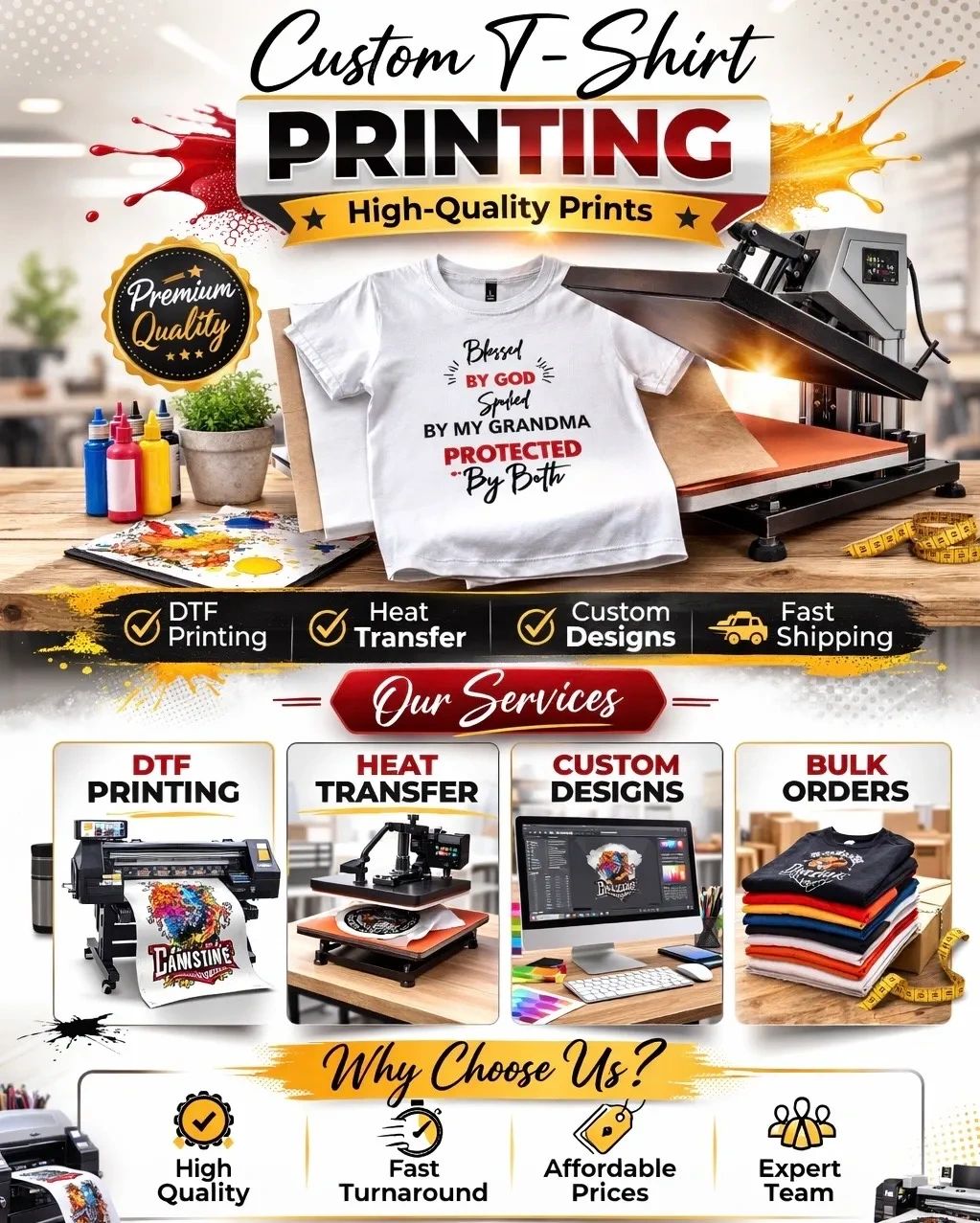 High-quality DTF prints on shirts, tumblers, hats & more — with vibrant gifts, perfect for businesses, teams, or events.